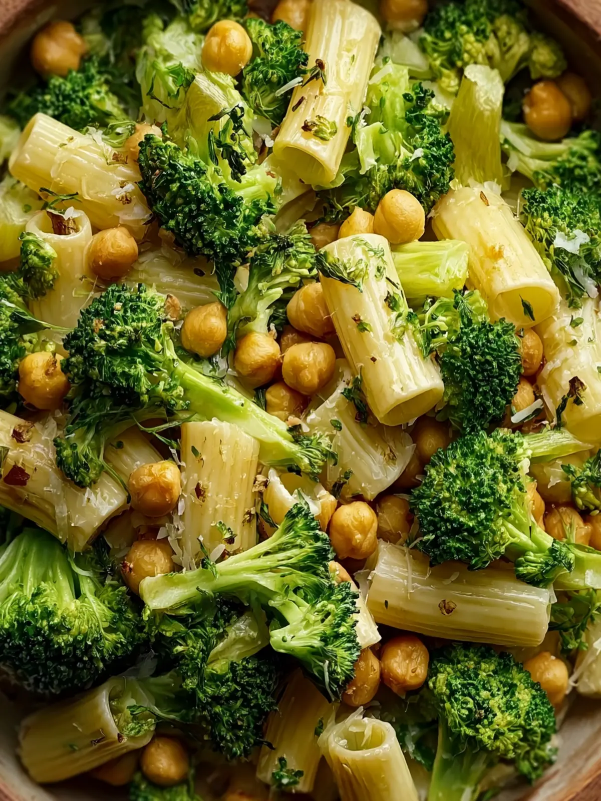 A comforting Mediterranean-inspired pasta dish featuring broccoli and chickpeas coated in a fragrant garlic olive oil sauce.