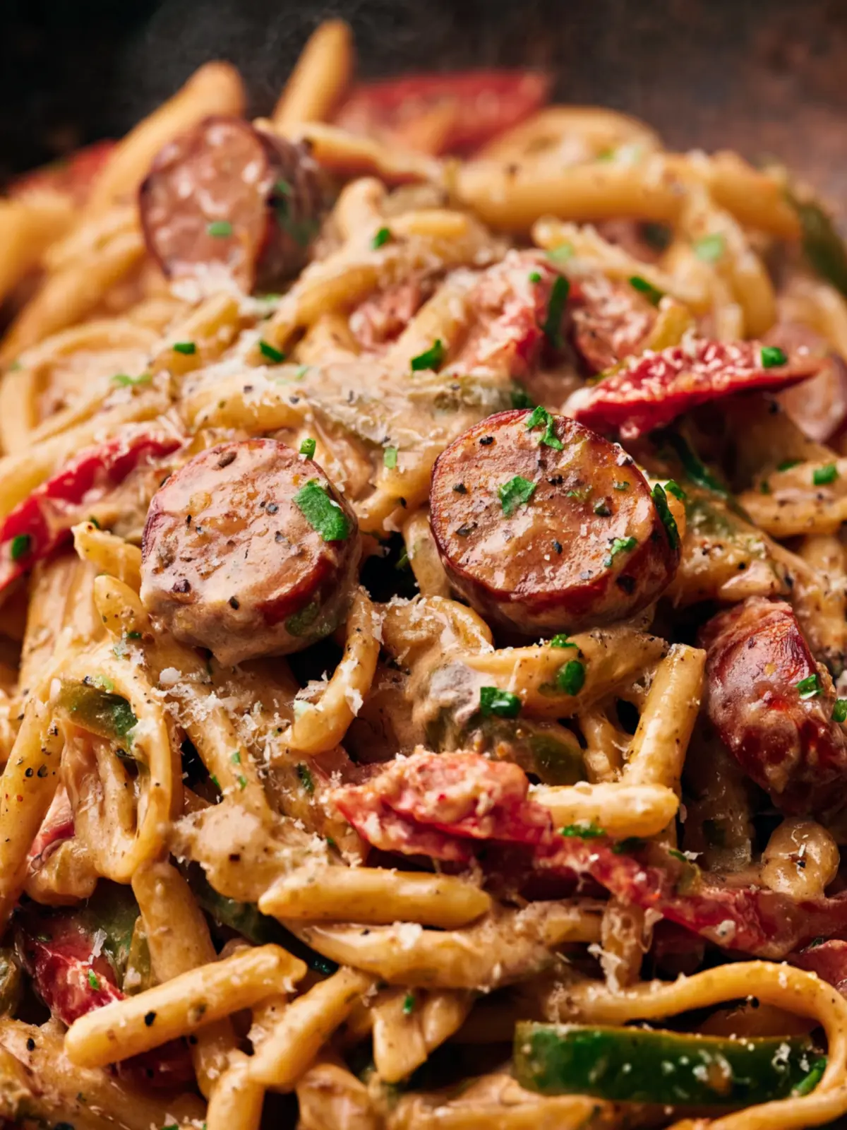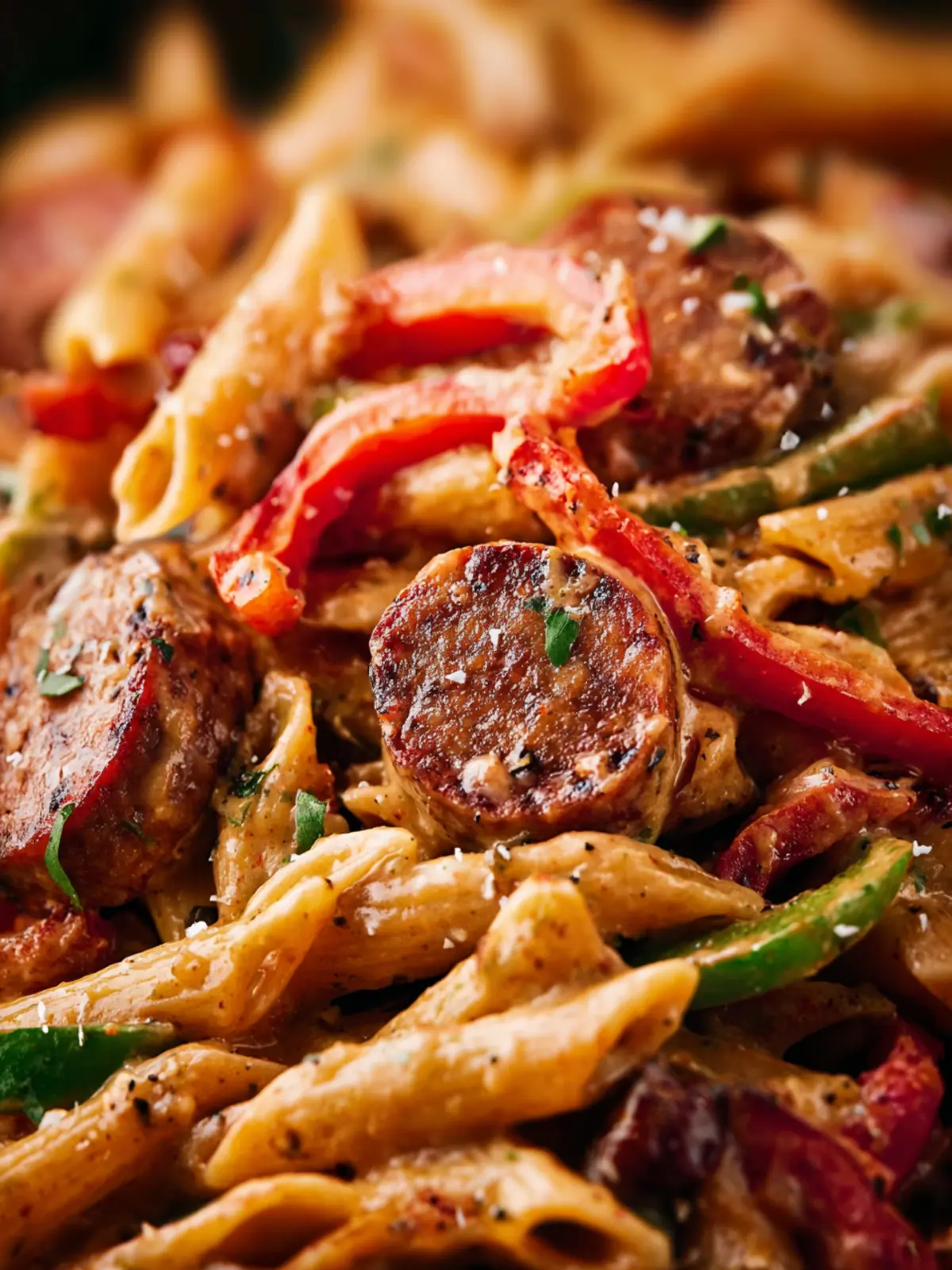 A creamy and flavorful pasta dish with smoked sausage, bell peppers, and Cajun seasoning.