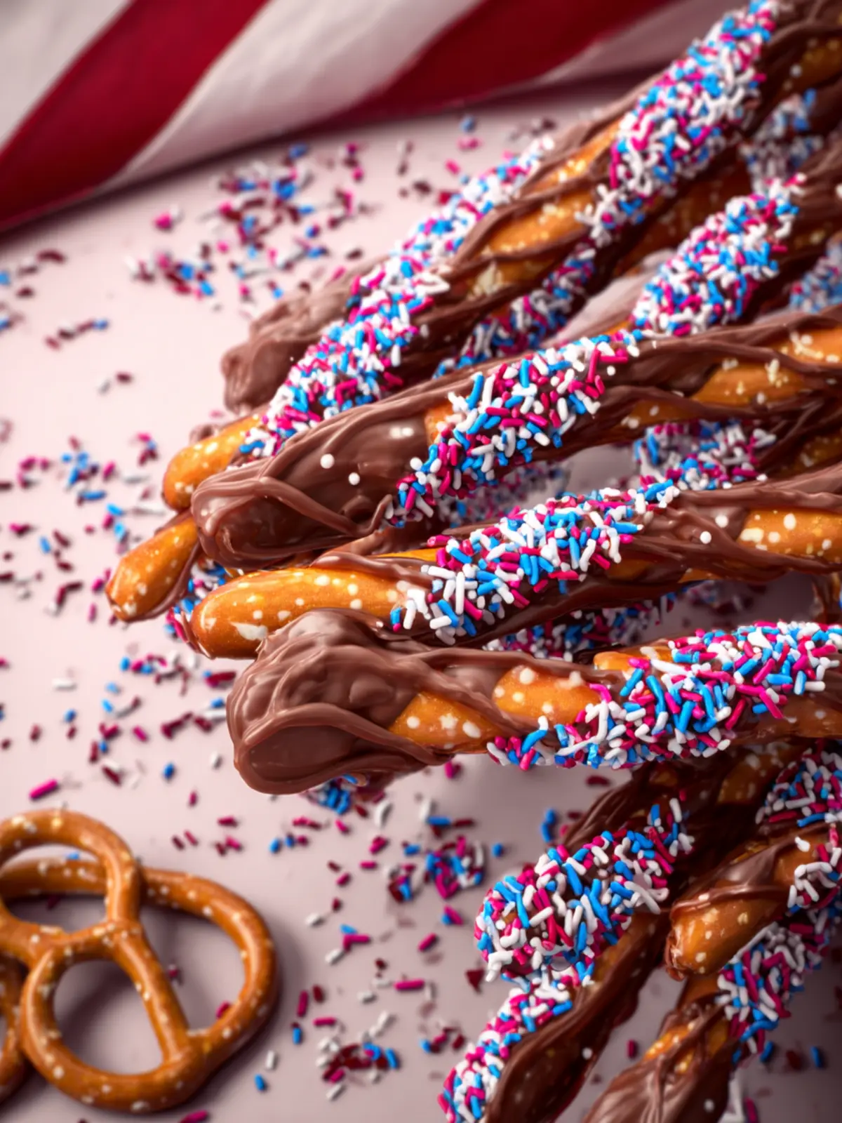 A delightful treat of pretzel rods coated in colorful candy melts, perfect for parties and celebrations!