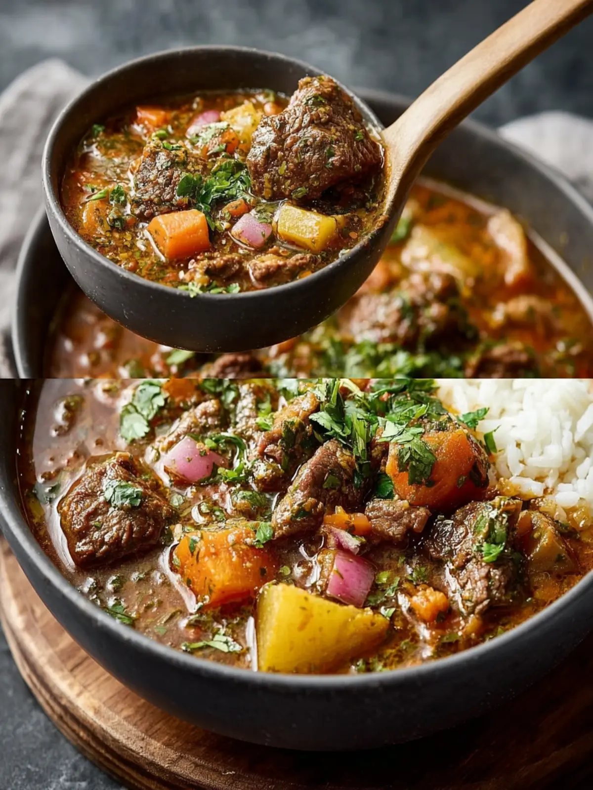 - Ladle the hot herb and beef stew over the rice.