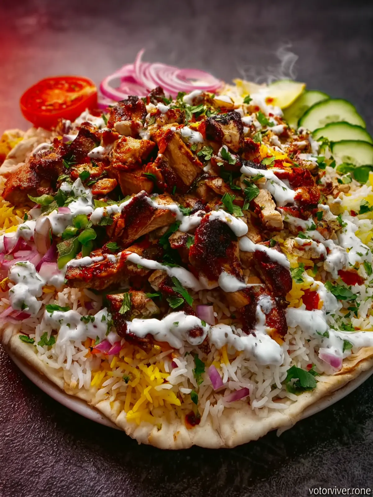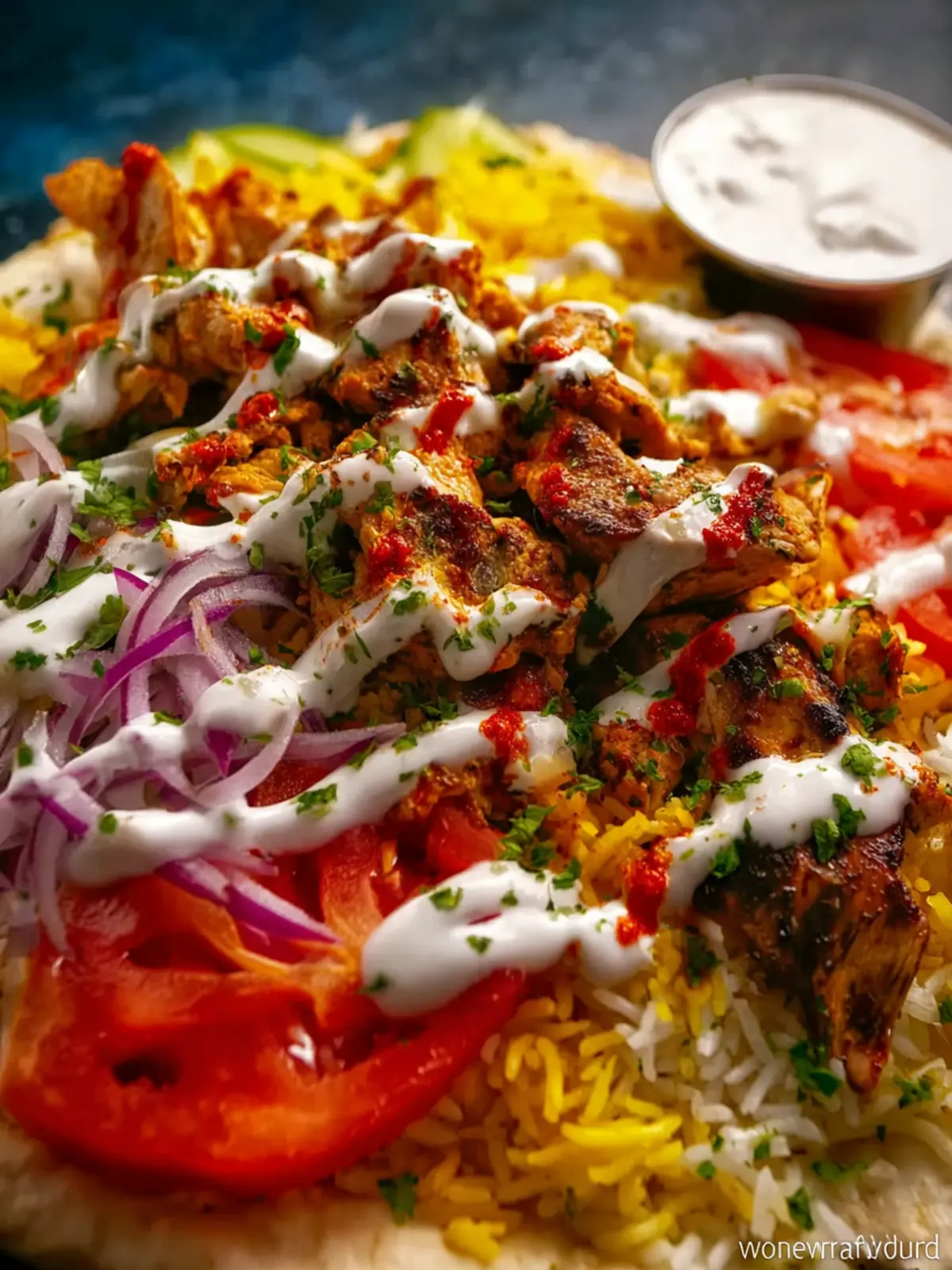 Tahini Sauce: Drizzle a homemade or store-bought tahini sauce over the chicken and rice. Its creaminess and nutty flavor pair beautifully with the spices of the dish, creating a satisfying contrast.