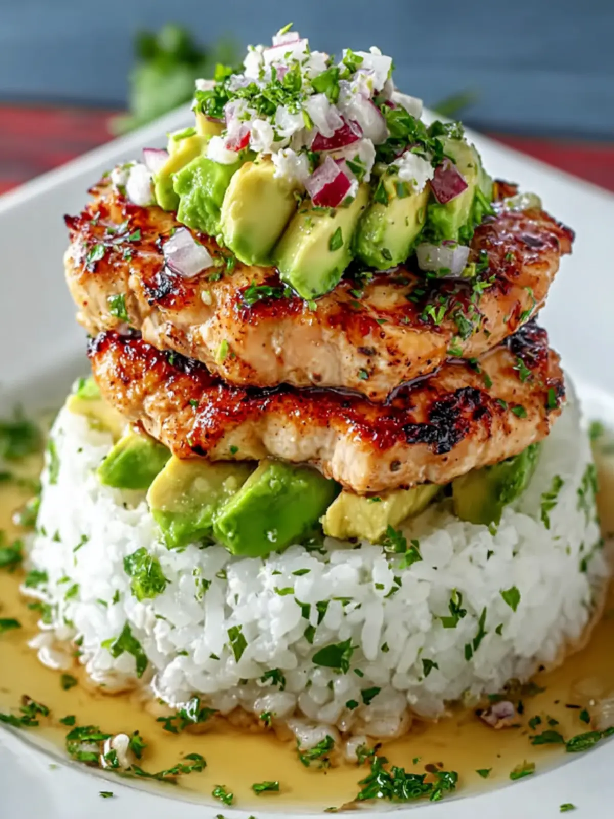 - Assemble the stack: Layer jasmine rice, sliced grilled chicken, and avocado salsa. Garnish with lime wedges.