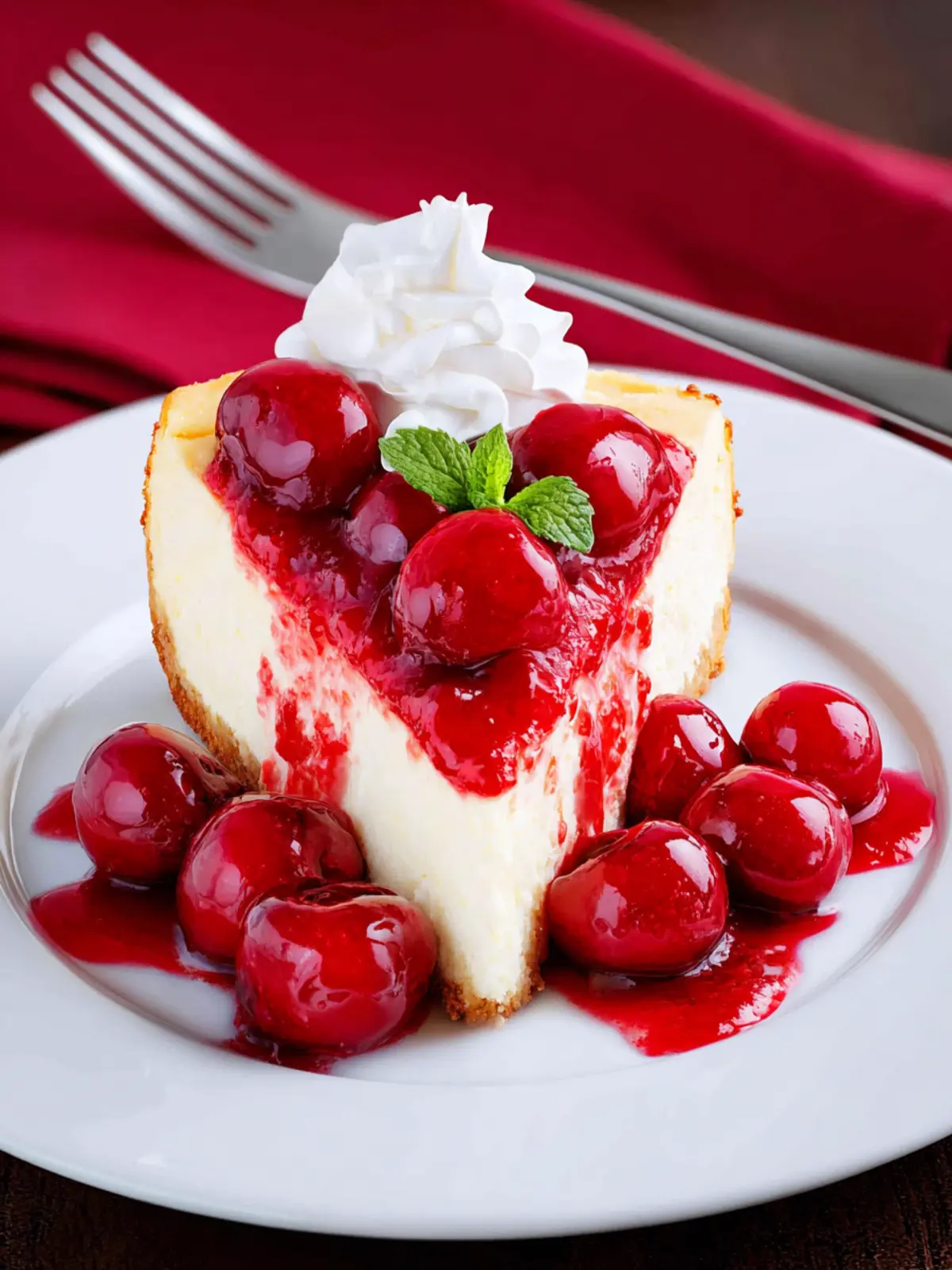 A rich and creamy cheesecake made with cream cheese, eggs, and topped with cherry pie filling or fresh berries.