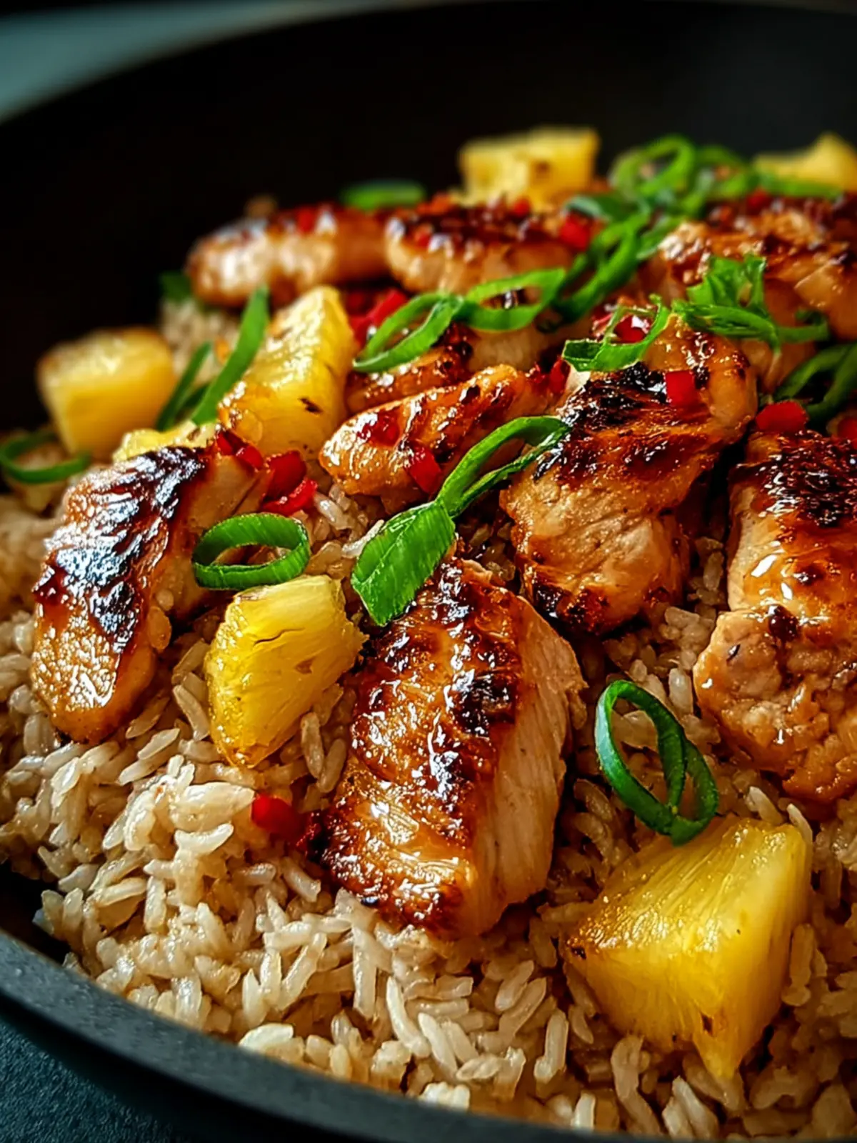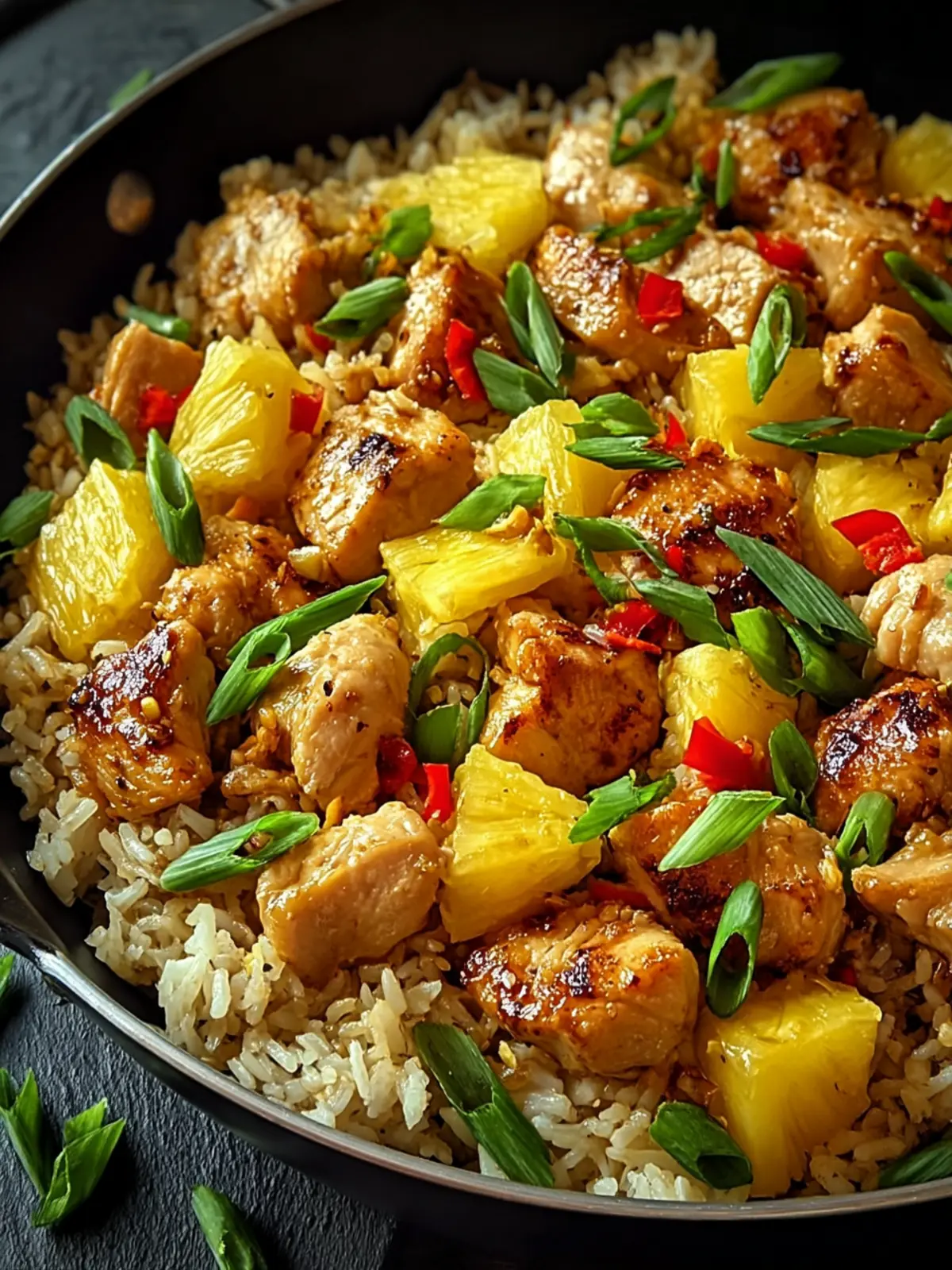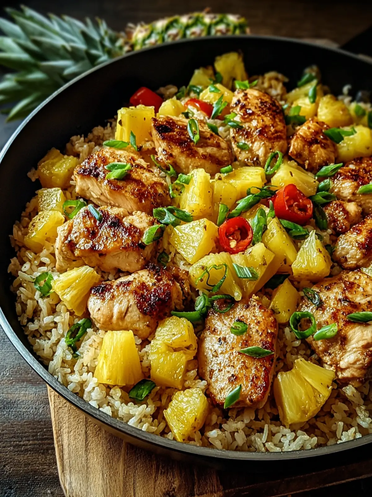 A delicious and savory dish combining chicken, rice, pineapple, and spices.