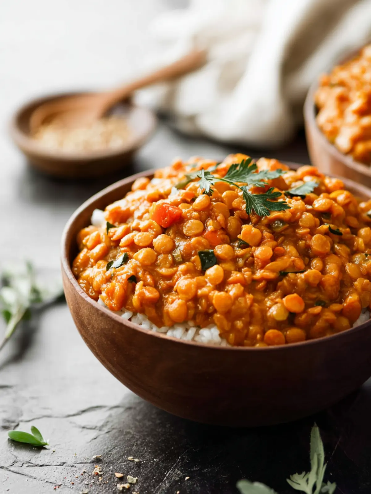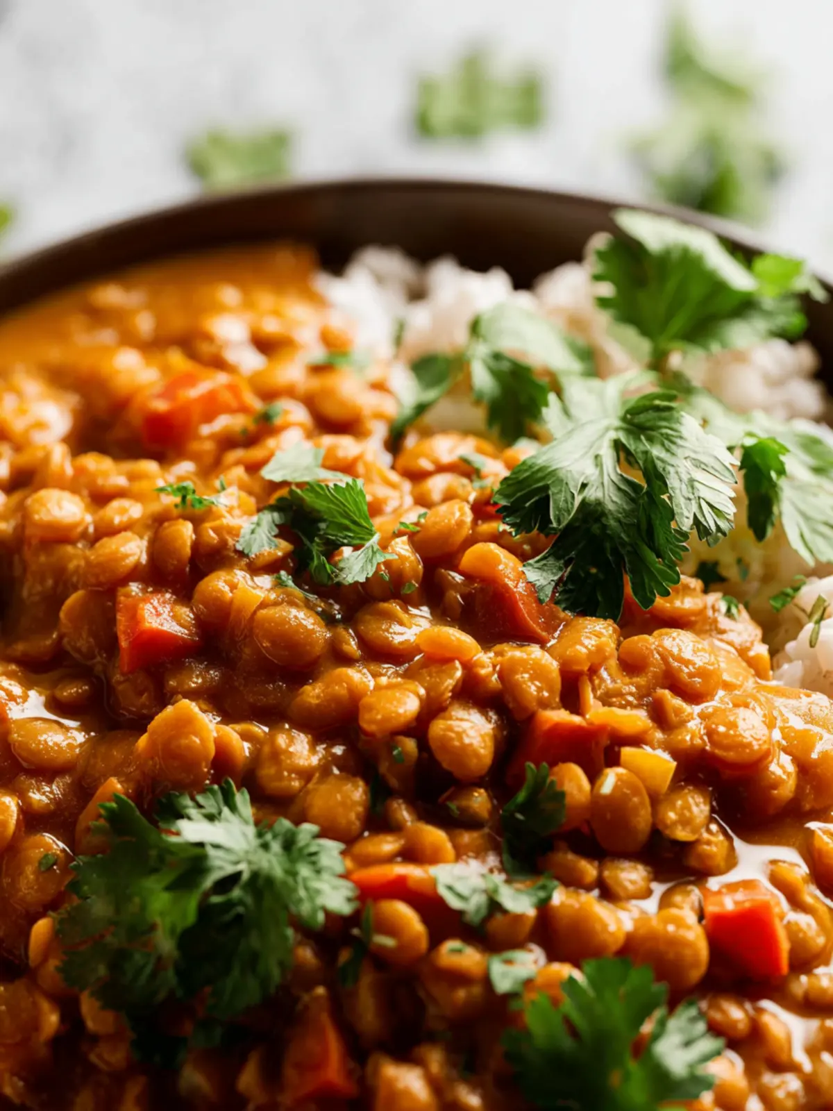 Enhance the flavors of your red curry lentils with a sprinkle of fresh cilantro or parsley. A wedge of lime adds a zesty kick, cutting through the richness of the dish.
