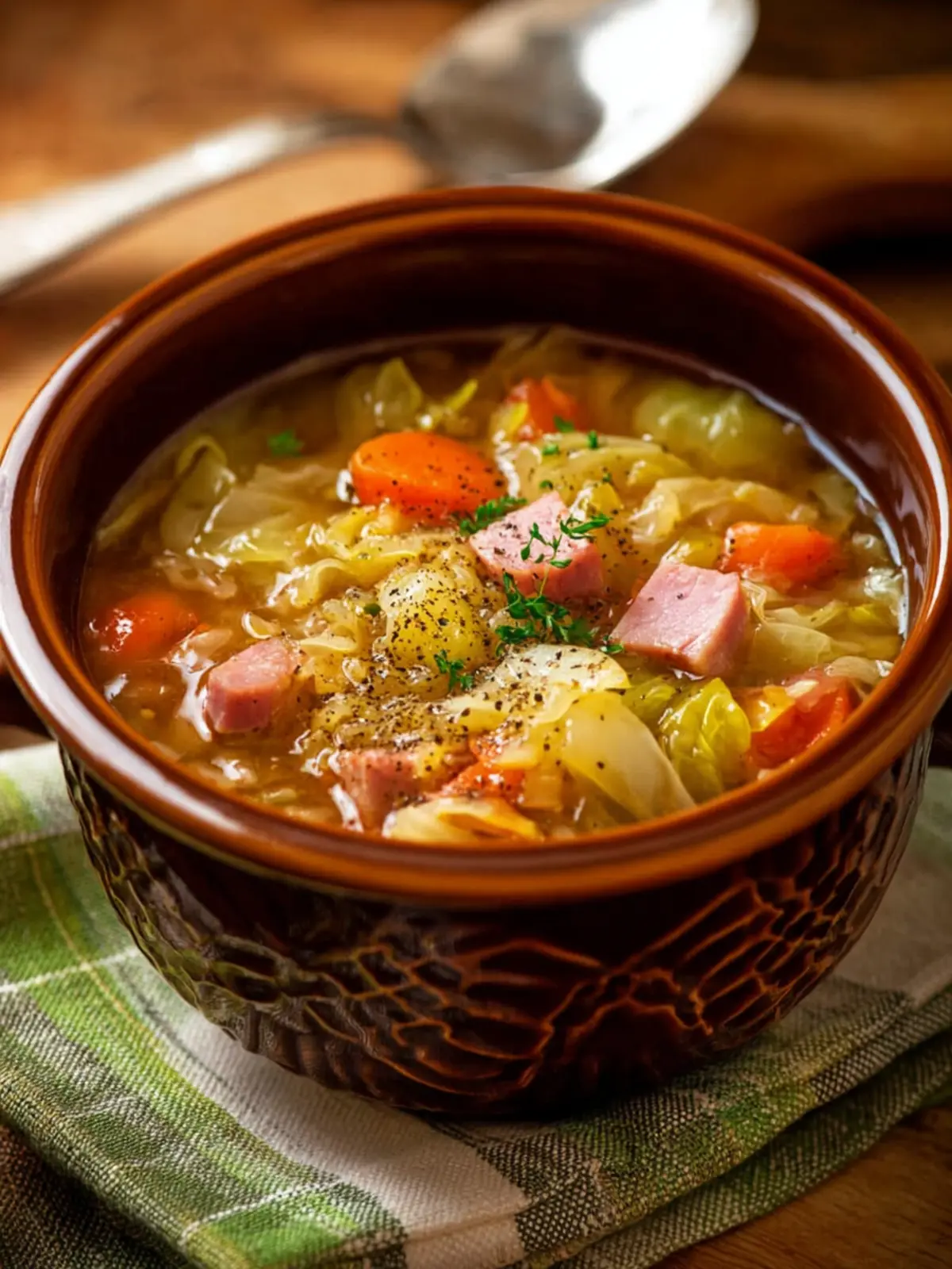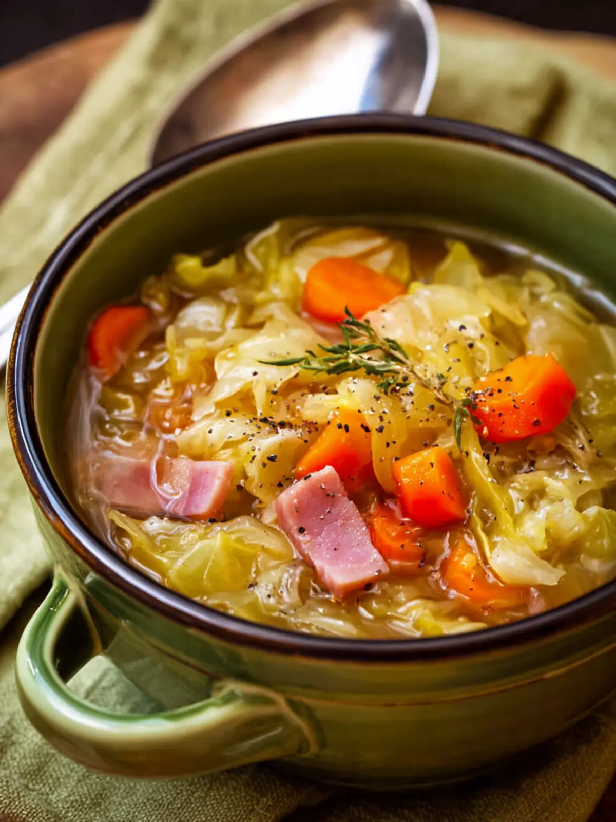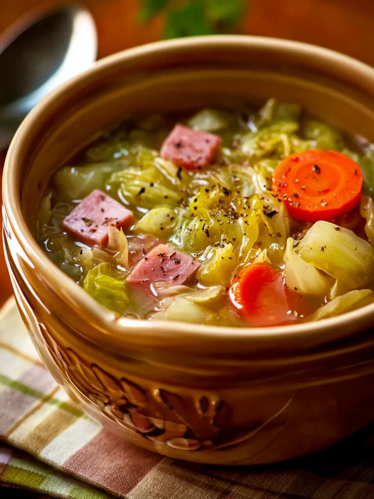 A comforting and hearty soup with tender cabbage, ham, and a medley of vegetables.